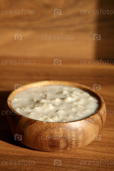 Овсяная каша в деревянной чашке в лучах солнечного утреннего света