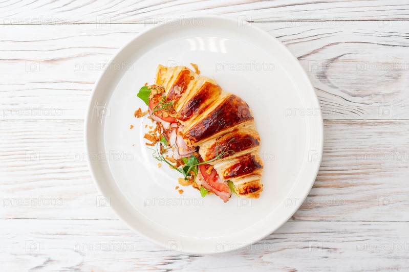 Сэндвич с круассаном, сливочным сыром и ветчиной на белой тарелке