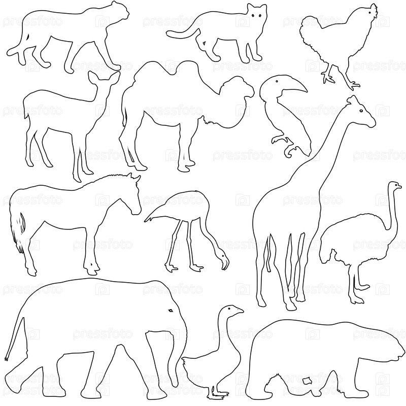Силуэт слона, тигра, медведя, жирафа, фламинго, пеликана, гуся на белом фоне