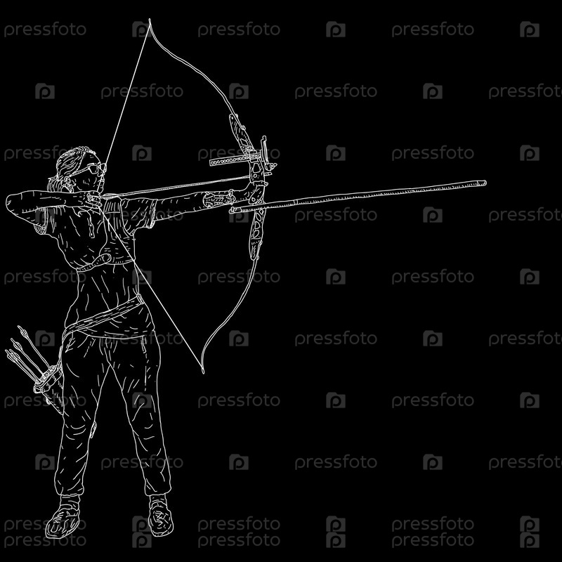 Эскизы силуэтов привлекательной женщины-лучника, сгибающей лук и целящейся в цель