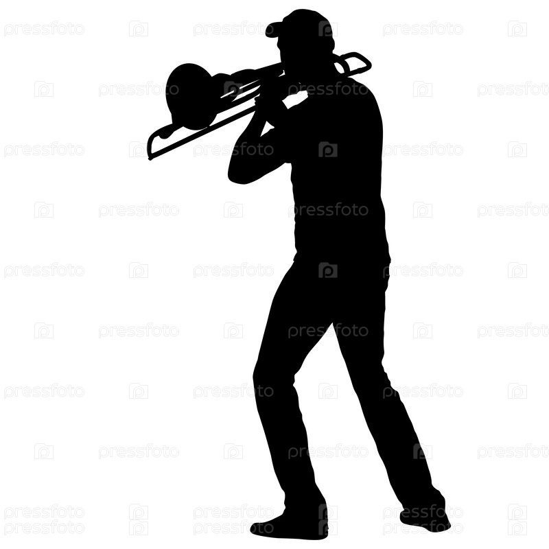 Силуэт музыканта, играющего на тромбоне на белом фоне