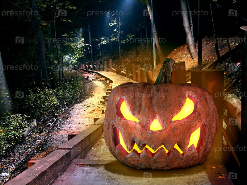Страшная Хэллоуинская тыква со светящимися глазами. На фоне лесной дороги, освещенной фонарями. Концепция осеннего праздника Хэллоуина