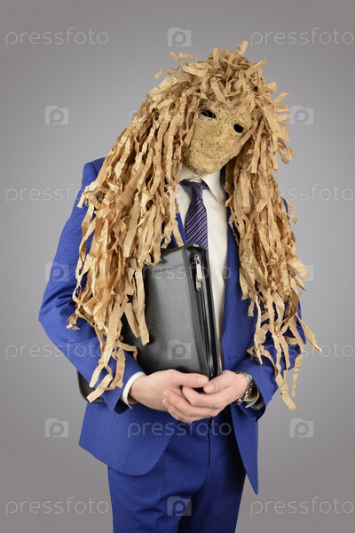 Мужчина в деловом костюме и в жуткой маске на сером фоне