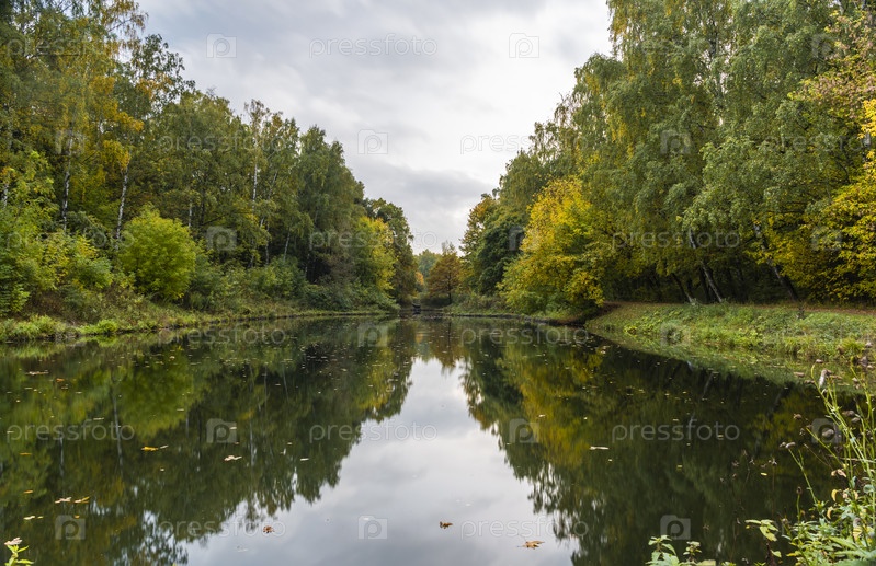 Лес обрамлен парковым прудом