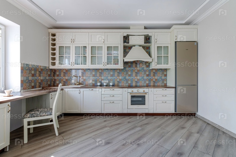 Аренда современного жилья, продажа новой квартиры, современный ремонт. Белая мебель с посудой, полки с посудой и растениями в горшках, холодильник в простой минимальной столовой, пустое пространство
