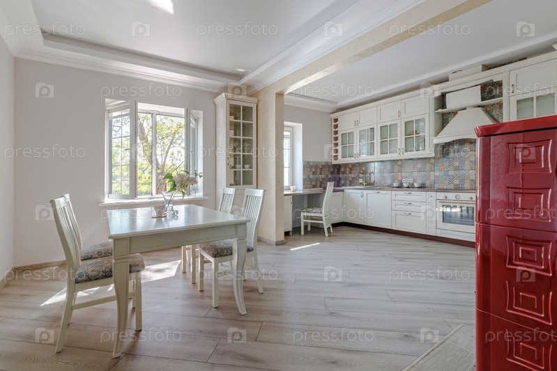 Аренда современного жилья, продажа новой квартиры, современный ремонт. Белая мебель с посудой, полки с посудой и растениями в горшках, холодильник в простой минимальной столовой, пустое пространство