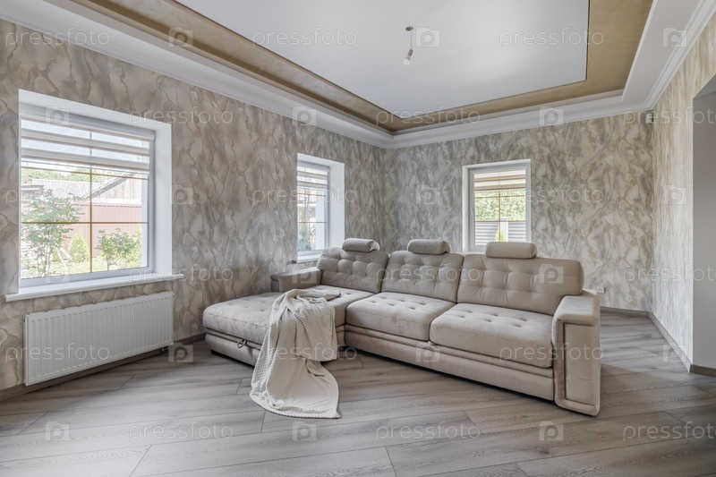 Пустая бежевая комната в новом доме с окнами и большим диваном