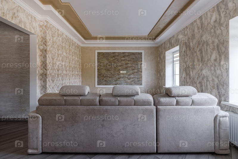 Пустая бежевая комната в новом доме с окнами и большим диваном