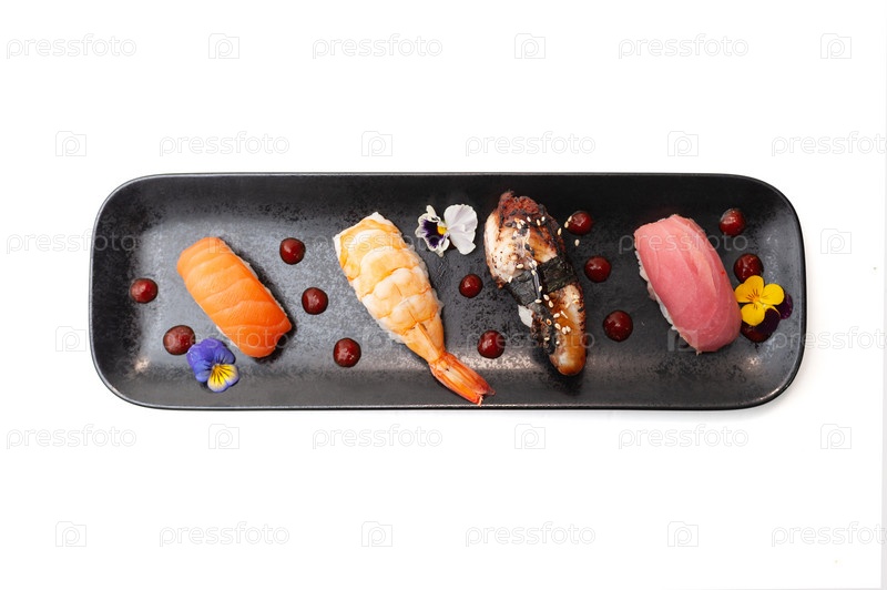 Нигири суши с лососем, угрем, тунцом и креветками на черной тарелке изолированы