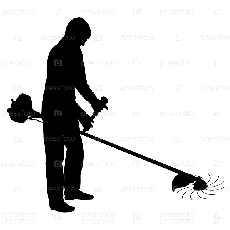 Силуэт работника сада срезает траву