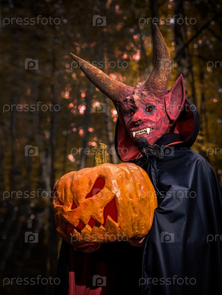 Дьявол с тыквой в руках на Хэллоуин в темном лесу. Страшный дьявол в маске