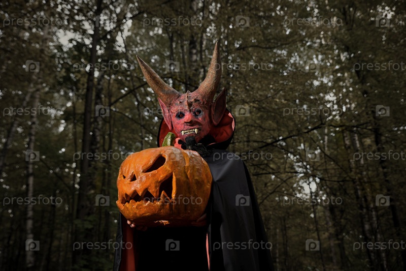 Дьявол в темном лесу с тыквой на Хэллоуин в руках