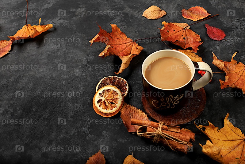 Чашка кофе с корицей и опавшими листьями на старом ржавом столе, гранж. Осенняя цветочная композиция, абстрактный фон, концепция праздника и Дня благодарения, открытка, выборочный фокус