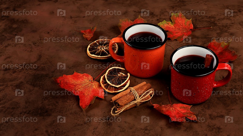 Две цветные красно-желтые эмалированные кружки с горячим осенним напитком, глинтвейн с яблоками и корицей и осенними опавшими листьями на ржавом столе, сезонный баннер или реклама, концепция «здравствуй осень», выборочный фокус, место для текста
