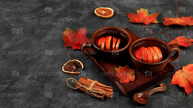 Две керамические темные кружки с горячим осенним напитком, глинтвейн с яблоками и корицей и осенние опавшие листья на ржавом столе, сезонный баннер или реклама, привет осенняя концепция, выборочный фокус, место для текста