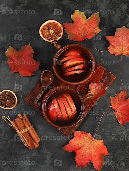 Две керамические темные кружки с горячим осенним напитком, глинтвейн с яблоками и корицей и осенними опавшими листьями на ржавом столе, сезонный баннер или реклама, привет осенняя концепция, выборочный фокус, место для текста