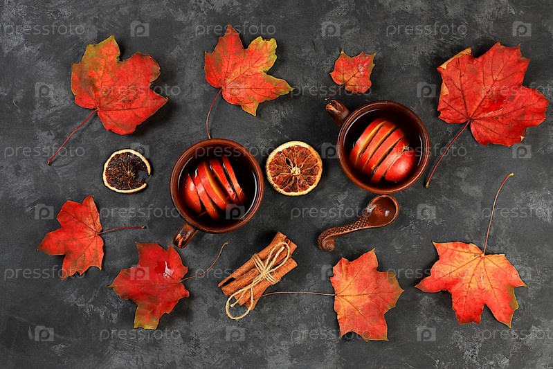 Две керамические темные кружки с горячим осенним напитком, глинтвейн с яблоками и корицей и осенними опавшими листьями на ржавом столе, сезонный баннер или реклама, привет осенняя концепция, выборочный фокус, место для текста