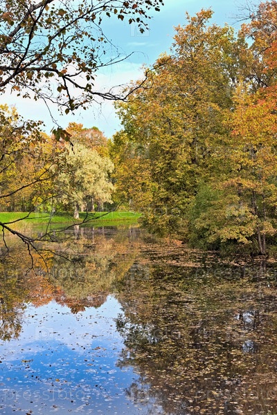 Золотой осенний сезон в России, фон. Осенний парк в октябре в солнечный день, озеро с красными кленовыми листьями и дубами. Красивый яркий природный ландшафт в парке, времена года, приглашение на прогулку, выборочный фокус