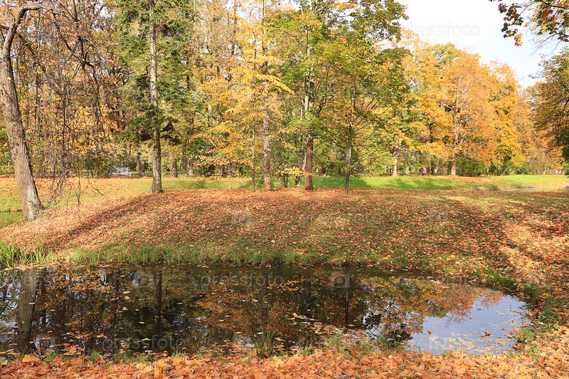 Золотой осенний сезон в России, фон. Осенний парк в октябре в солнечный день, озеро с красными кленовыми листьями и дубами. Красивый яркий природный ландшафт в парке, времена года, приглашение на прогулку, выборочный фокус