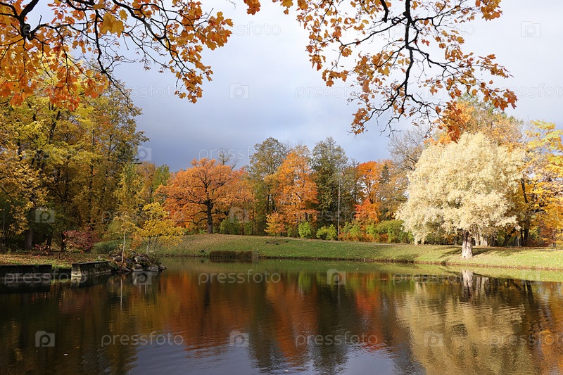 Золотой осенний сезон в России, фон. Осенний парк в октябре в солнечный день, озеро с красными кленовыми листьями и дубами. Красивый яркий природный ландшафт в парке, времена года, приглашение на прогулку, выборочный фокус