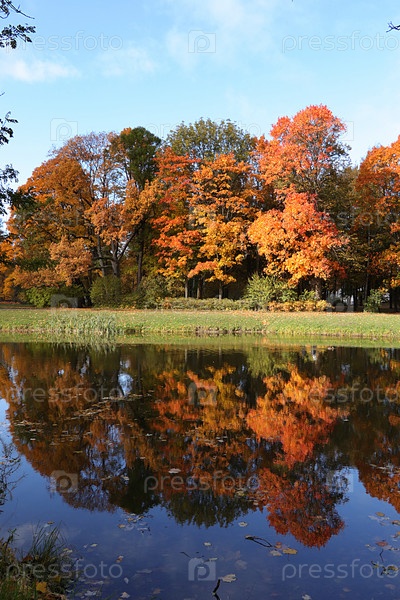 Золотой осенний сезон в России, фон. Осенний парк в октябре в солнечный день, озеро с красными кленовыми листьями и дубами. Красивый яркий природный ландшафт в парке, времена года, приглашение на прогулку, выборочный фокус
