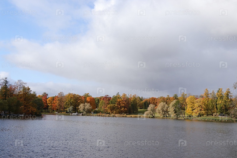 Золотой осенний сезон в России, фон. Осенний парк в октябре в солнечный день, озеро с красными кленовыми листьями и дубами. Красивый яркий природный ландшафт в парке, времена года, приглашение на прогулку, выборочный фокус