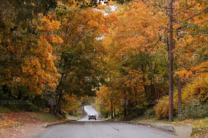Россия, Санкт-Петербург, 28 сентября 2019 года, Дудергофские высоты. На фото - осенняя дорога с яркими листьями и мотоциклист, едущий по делам. Красота октябрьского леса