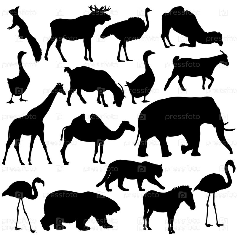Силуэт лося, медведя, гуся, зебры, фламинго, слона на белом фоне