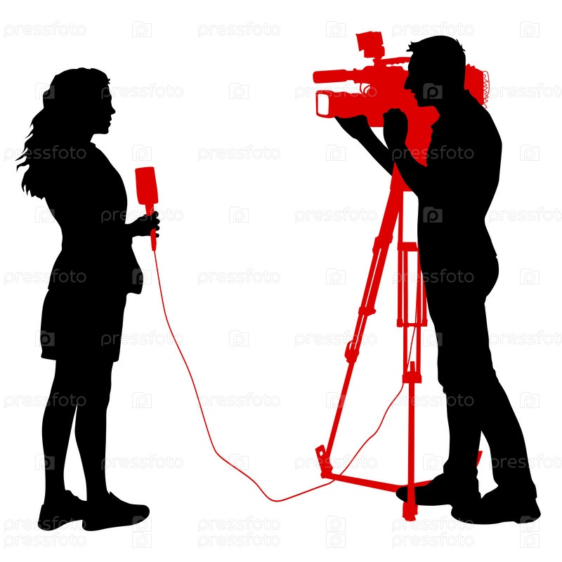 Оператор силуэта удаляет журналиста с микрофоном на белом фоне