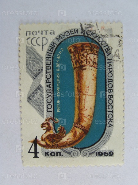 Старая коллекционная марка с горном на белом фоне