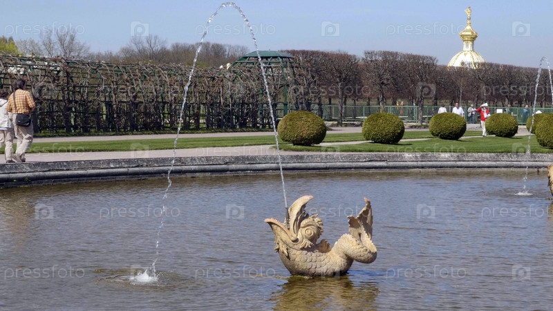 СТ. САНКТ-ПЕТЕРБУРГ, РОССИЯ, 12 мая 2018 года: Петергоф или Петергоф, известный как Петродворец с 1944 по 1997 год, и фонтан Нептуна 12 мая 2018 года в Санкт-Петербурге, Россия, Санкт-Петербург. ПЕТЕРБУРГ, РОССИЯ, 12 мая 2018 года: Петергоф или Петергоф,
