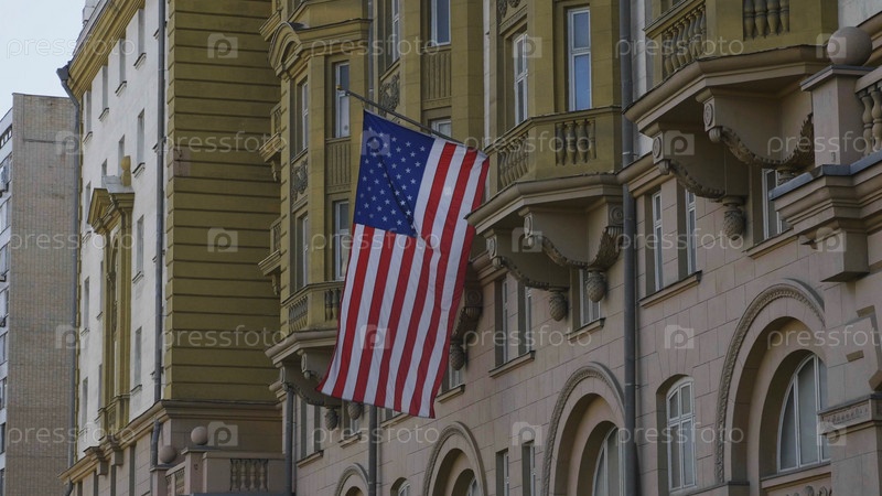 Обернутый вокруг флагштока флаг США в России Москва