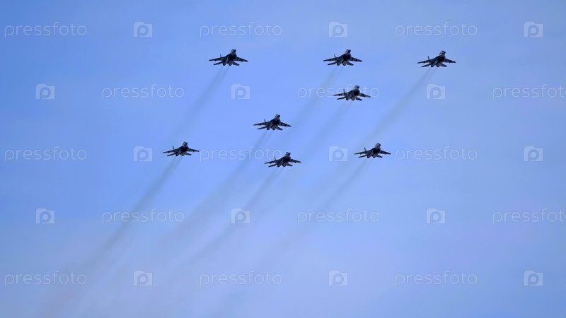 Группа реактивных истребителей МиГ-29 в форме буквы Z в небе на параде Победы во Второй мировой войне в Москве, Россия