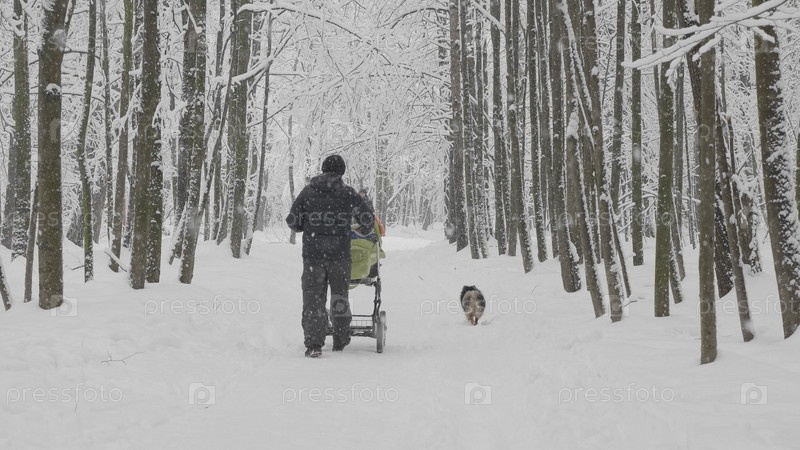МОСКВА - 17 ЯНВАРЯ: зимняя прогулка отца с ребенком в коляске с собакой 17 января 2018 года в Москве, Россия