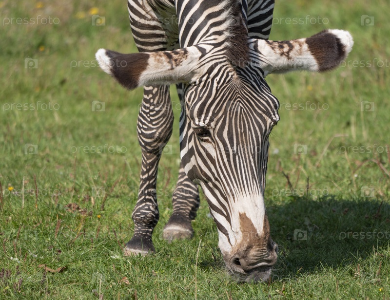 Африканская красивая зебра есть свежую зеленую траву