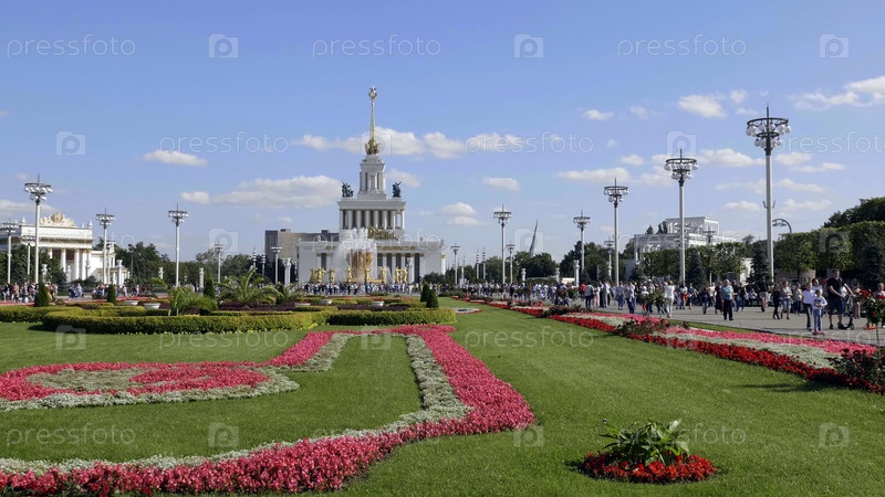 Москва, Россия - 01 МАРТА 2019 г.: Фрагмент центральной части фасада павильона Центральный на ВДНХ в Москве на фоне голубого неба