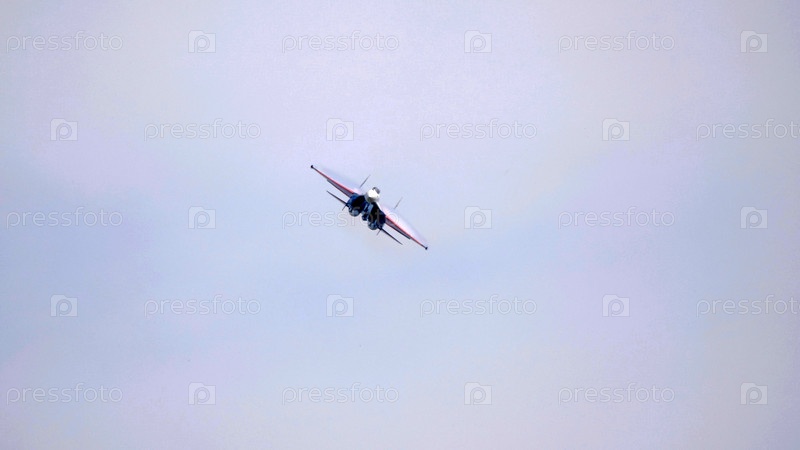 Москва Россия Аэродром Жуковский 25 июля 2021 года: Пилотажные группы "Русские витязи" на самолетах Су-35 международного аэрокосмического салона МАКС-2021