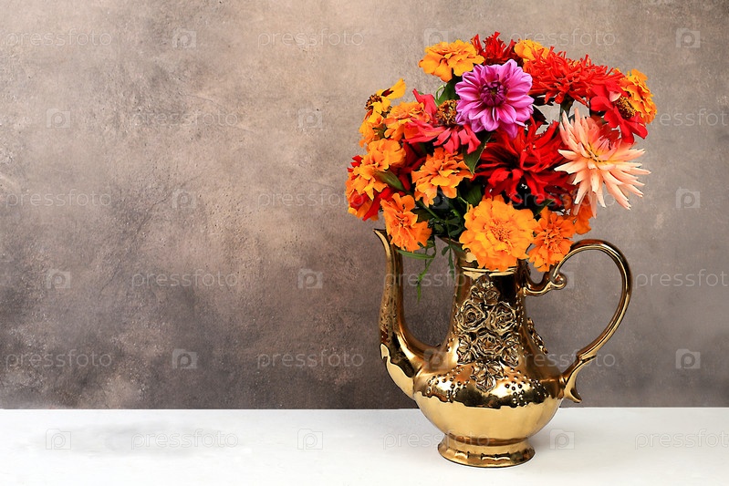 Красивые цветы георгина в вазе, абстрактная цветочная композиция, осенний фон с местом для текста, минимальная концепция праздника, натюрморт, открытка. С днем рождения, свадьба, избирательный фокус