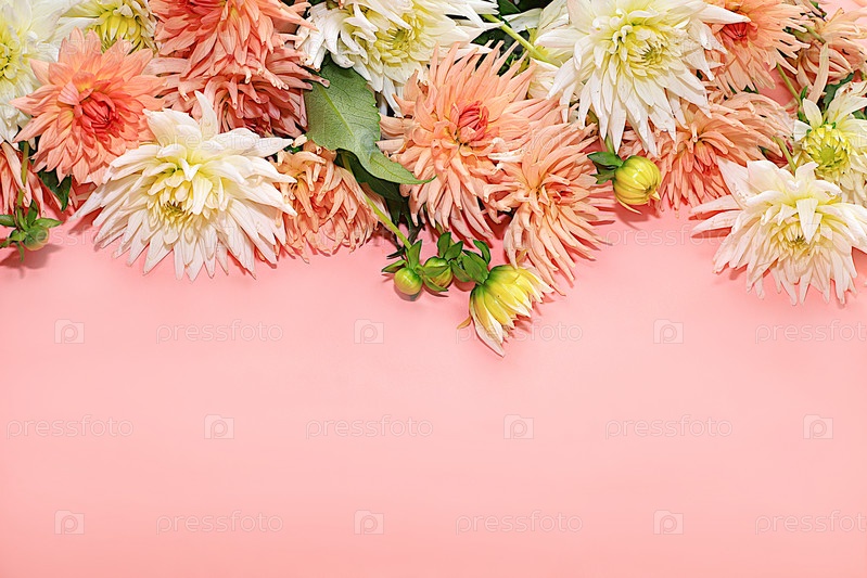 Рамка из цветов георгина, абстрактная цветочная композиция, весенний или осенний фон с местом для текста, минимальная концепция праздника, натюрморт, поздравительная открытка. избирательный фокус
