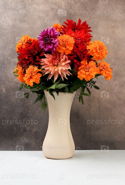 Красивые цветы георгина в вазе, абстрактная цветочная композиция, осенний фон с местом для текста, минимальная концепция праздника, натюрморт, открытка. С днем рождения, свадьба, избирательный фокус