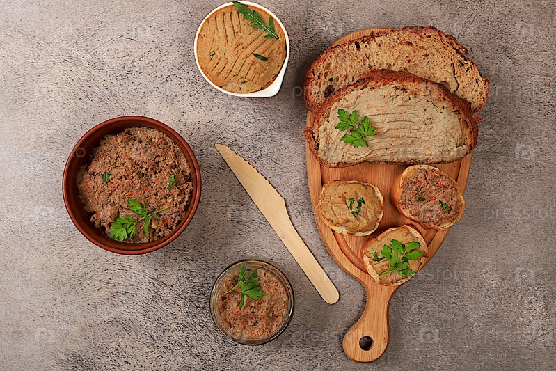 Куриный паштет с домашним цельнозерновым хлебом и зеленью на темном столе, концепция здорового образа жизни и натурального питания. Здоровый завтрак с ингредиентами, реклама кафе, выборочный фокус