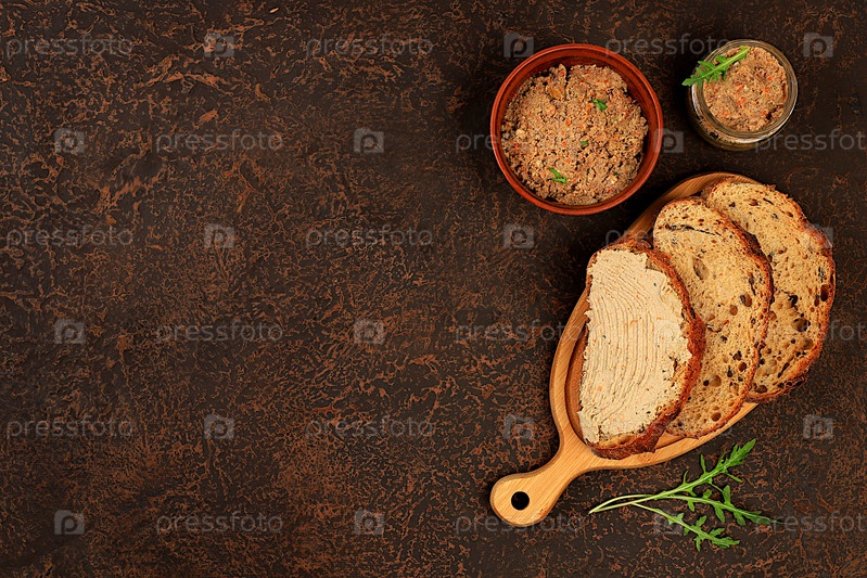 Домашний цельнозерновой хлеб с куриным паштетом и рукколой на бетонном фоне, концепция здорового образа жизни и натурального питания. Здоровый завтрак с ингредиентами, реклама кафе, выборочный фокус