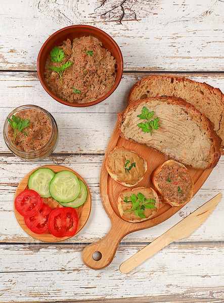 Домашние бутерброды с куриным паштетом, помидорами, зеленью и огурцами, концепция здорового образа жизни и натурального питания. Здоровый завтрак с ингредиентами, реклама кафе, выборочный фокус