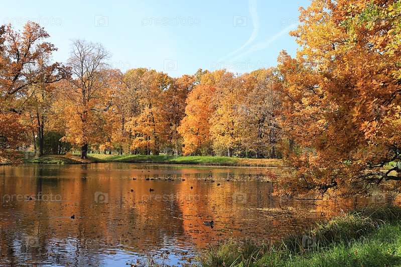 Золотой осенний сезон в России, фон. Осенний парк в октябре в солнечный день, озеро с красными кленовыми листьями и дубами. Красивый яркий природный ландшафт в парке, времена года, приглашение на прогулку, выборочный фокус