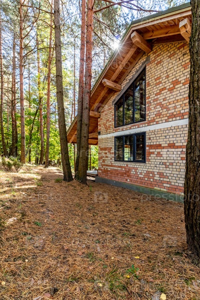 Строящийся дом в сосновом лесу в солнечный осенний день