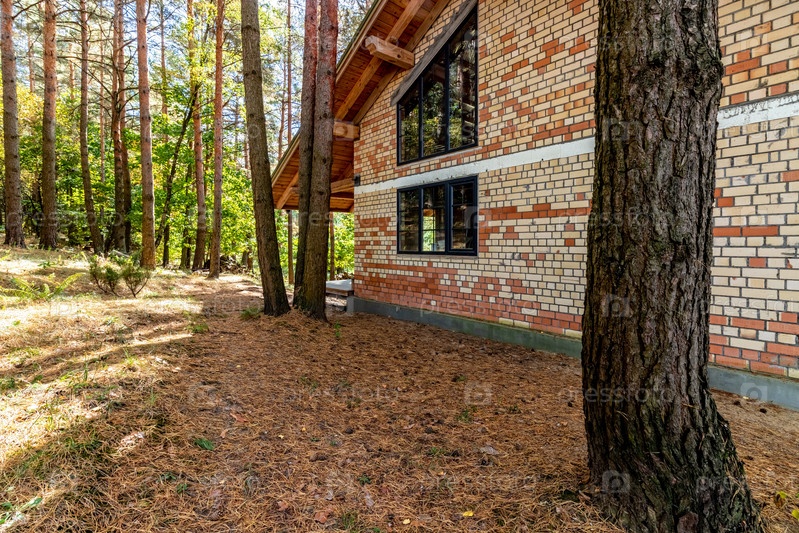 Строящийся дом в сосновом лесу в солнечный осенний день