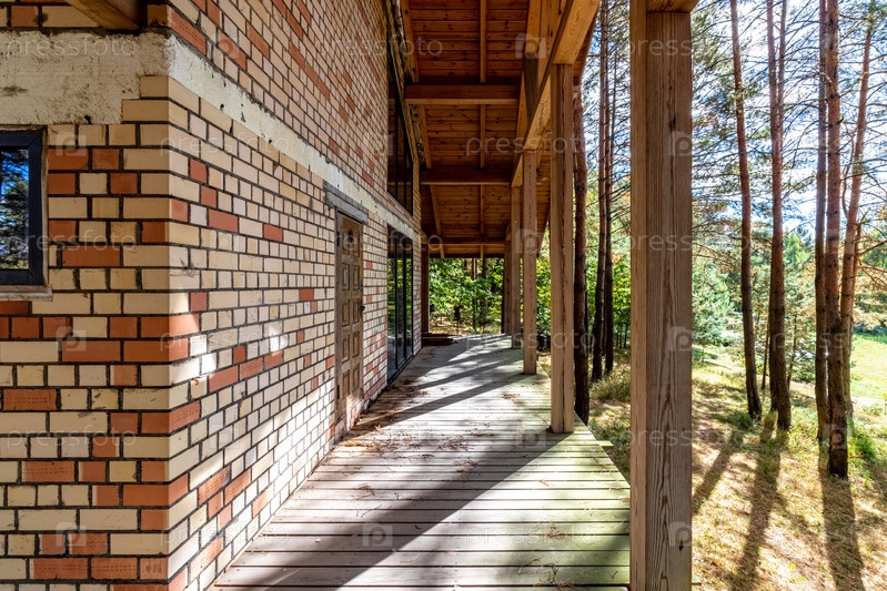 Строящийся дом в сосновом лесу в солнечный осенний день