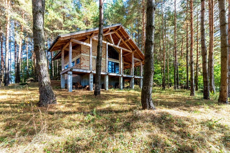 Строящийся дом в сосновом лесу в солнечный осенний день