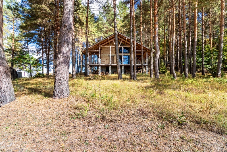 Строящийся дом в сосновом лесу в солнечный осенний день