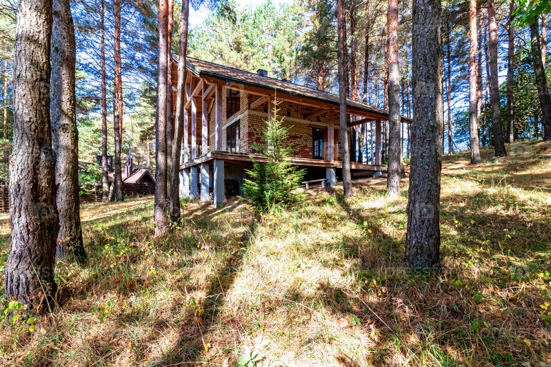 Строящийся дом в сосновом лесу в солнечный осенний день